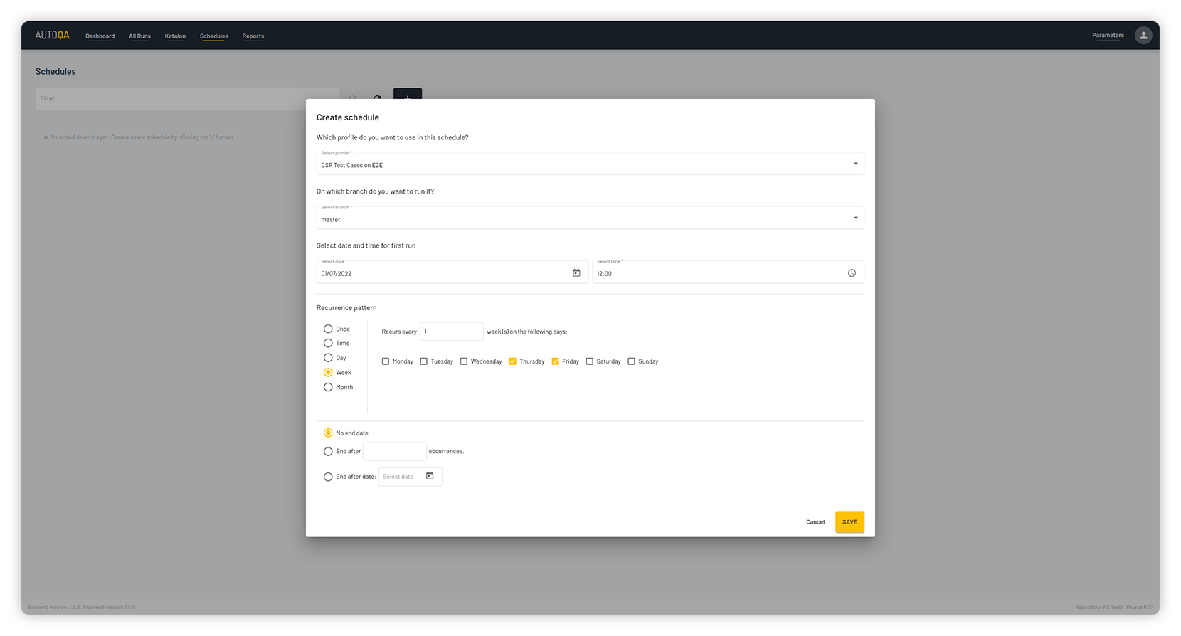 Schedule tests by time, day, week or month along with number of recurrences so they can run automatically.
