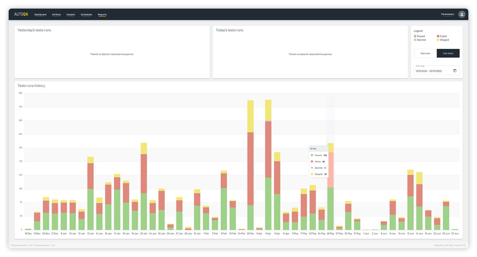 Report overview of all test runs conducted in a period of time including tests which have been passed, failed, skipped and aborted.